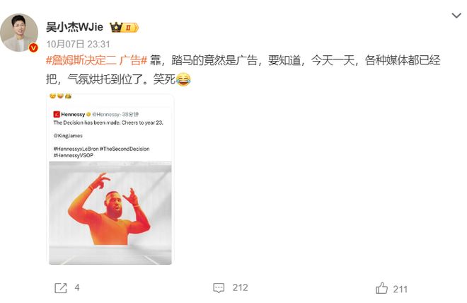 詹皇决定二登国内热搜:把巴斯当猴耍 轩尼诗陷负面评价 纯属自黑