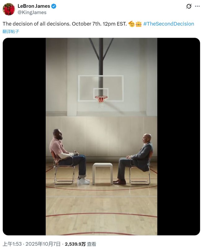 2025年10月7日,洛杉矶湖人队超级球星勒布朗·詹姆斯通过社交媒体发布了一条名为“第二次决定”的短视频,并宣布该视频将于北京时间10月8日0点正式公开。这一举动迅速引发外界